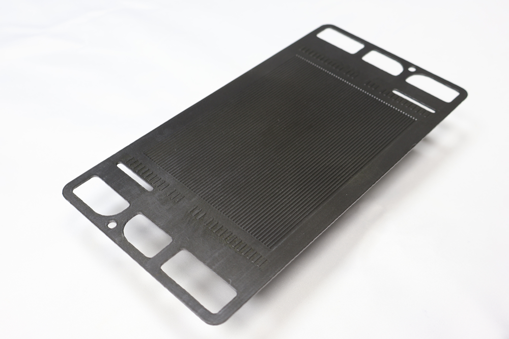 カーボン粉末と熱硬化樹脂を独自配合したカーボンセパレータです。金型プレス成型の採用により、流路の切削加工が不要となり、コストを抑えることが可能です。また、セパレータの薄肉化によって、軽量化や高伝導性を実現しています。