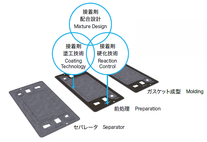 表裏同時成形技術を採用し、水素と酸素、そして冷却水の漏れを防ぐゴム製シール材(ガスケット)をセパレータと呼ばれる板状の部材に集約しました。集約によりセル化工程の接着が不要となり、トータルの工数を削減することでコストダウンにも貢献します。